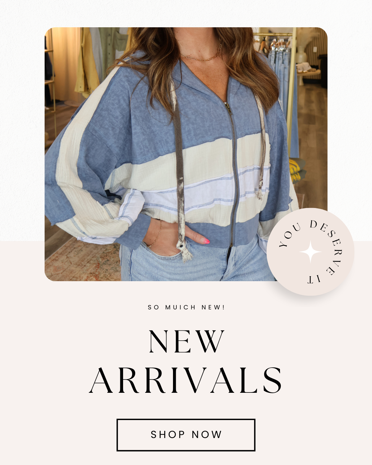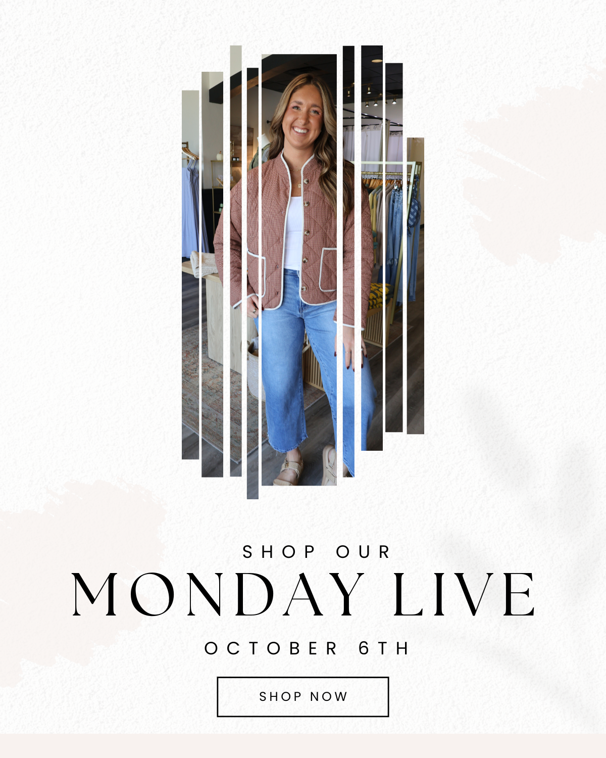 Our live viewers get first grabs at our new arrivals. While Facebook live, we try on the pieces... answer styling questions... etc. If there is a piece you want, simply comment the piece name and your size.